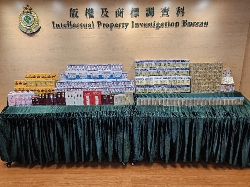 香港海關昨日(六月四日)在旺角和火炭採取特別行動,打擊售賣冒牌物品活動,檢獲約五千件懷疑冒牌物品,包括藥物和化妝品,估計市值約六十二萬元。圖示部分檢獲的懷疑冒牌物品。