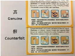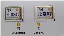 Printing of some words and diagrams on the box of the counterfeit health product drink are unclear when compared to the genuine goods. Also, the printing on the silvery coating covering the QR code security label is different from that of the genuine one. Moreover, the opening cut on the sachet of counterfeit product is placed at the bottom right when it is viewed from the front whereas for the genuine product, the opening cut on the sachet is placed at the bottom left when it is viewed from the front.